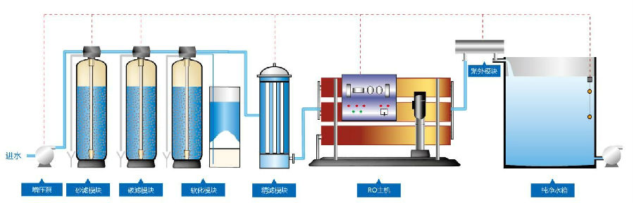 原水箱→增压泵→多介质过滤器→活性炭过滤器→保安过滤器→高压泵→一级反渗透→高压泵→二级反渗透→纯水箱→臭氧灭菌→成品水箱→纯水泵→微孔过滤器→灌装